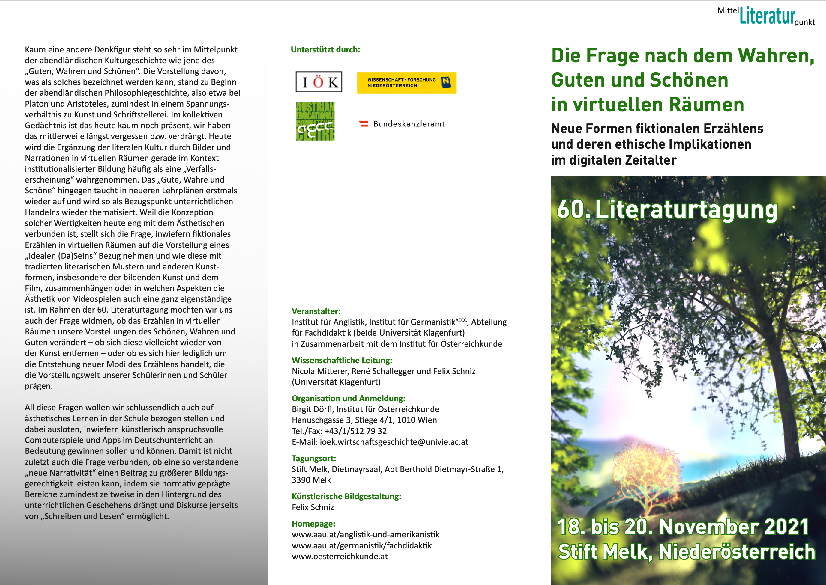 Präsentation Hoffen und Bangen: Zukünfte in Literatur, Film und Games, im Rahmen der 60. Literaturtagung Die Frage nach dem Wahren, Guten und Schönen in virtuellen Räumen, veranstaltet von der Universität Klagenfurt in Kooperation mit dem Institut für Österreichkunde, Stift Melk, Austria, 9-10 Uhr (online).